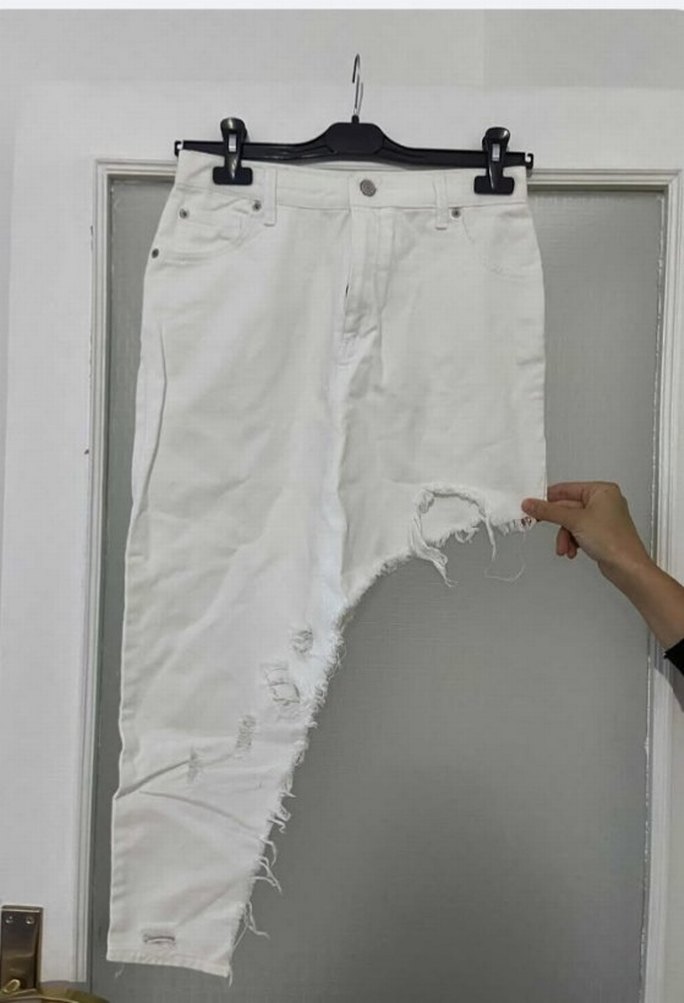 Yırtık detaylı, beyaz renk, bol kesim midi kot pantolon, rahat günlük kullanım için uygundur.