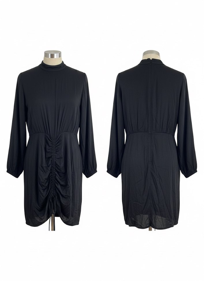 Siyah renkli, yüksek yakalı ve uzun kollu bu dar kesim midi elbise, keten kumaştan olup ön kısmında drapeli detay bulunur. Minimalist ve goth tarzlara uygundur, ofis için idealdir.