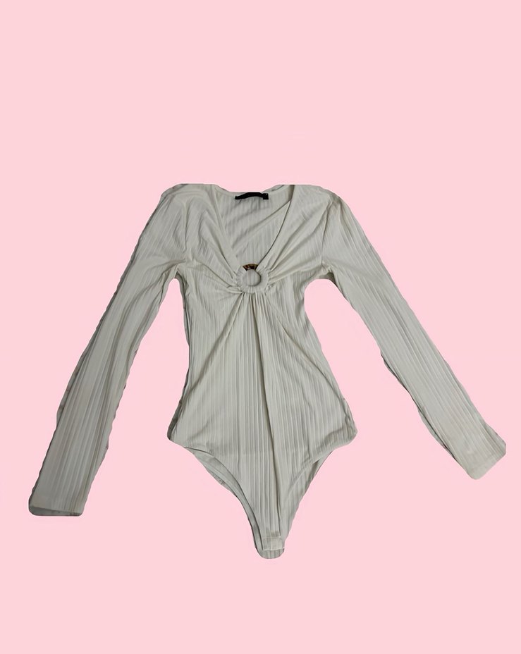 Beyaz, uzun kollu ve V yakalı bu fitted body, halka detayına sahip. Sondaki görselde oluşan minik yırtık büyük ihtimalle makina kaynaklı başka sorunu yoktur.