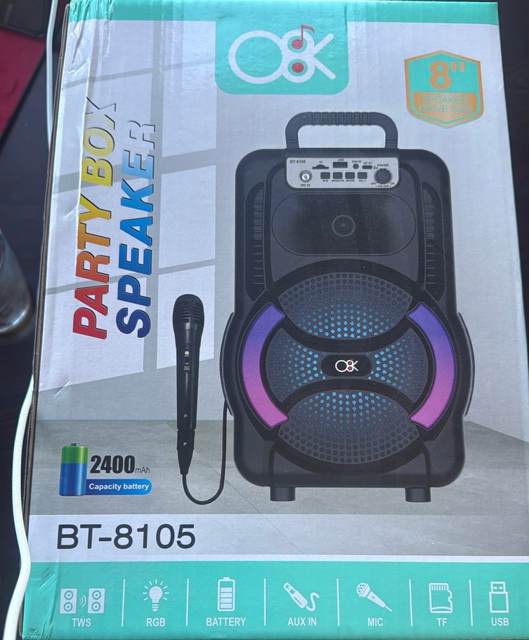 BT-8105 siyah Bluetooth hoparlör, 8 inç sürücü, 2400mAh batarya, RGB ışıklandırma ve AUX, USB, TF kart, mikrofon girişleri sunar. Kablosuz mikrofon dahildir.