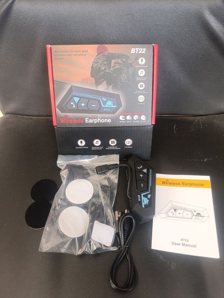 BT22 siyah kablosuz kulaklık araç kiti, eller serbest iletişim ve kolay kontrol sağlar. Kulaklık, şarj kablosu ve kullanım kılavuzu dahildir.