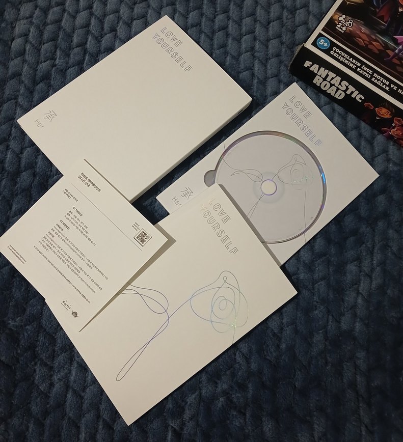 BTS Love Yourself albümü, minimal beyaz ambalaj ve ince çizgi sanatları içeren CD ile birlikte gelir. Albüm başlığı ve detaylı kitapçık içerir.