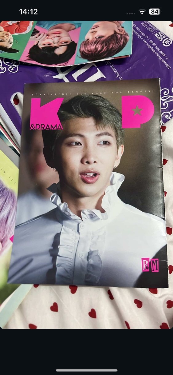 &DRAMA dergisi RM kapaklı, beyaz fırfırlı gömlekle yakın çekim portre yer alıyor. Pop kültür içeriği sunuyor. İkili fiyati