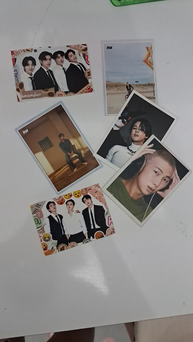 BTS üyelerinin farklı poz ve kıyafetlerde fotoğraflarının yer aldığı koleksiyon kartları.