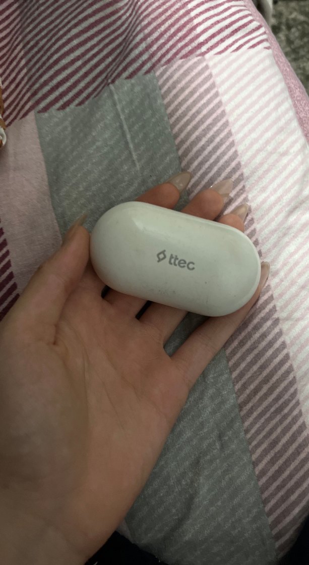 Bttec beyaz kulaklık şarj kutusu, üstünde gri logo ile kompakt tasarıma sahiptir. Taşıması kolaydır.