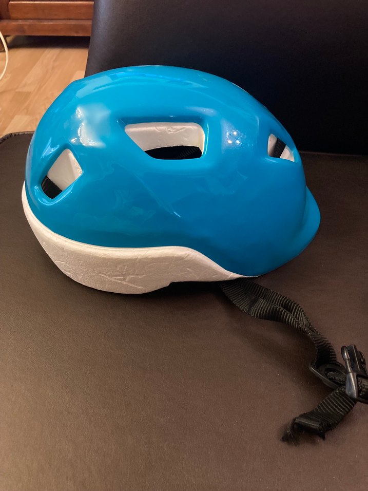 Havalandırma delikleri ve cırt cırtlı kayışlı mavi biker tarzı plastik kask. Basit ve renkli tasarım. Small-medium beden