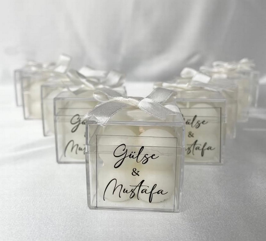 Özel isimler ve dekoratif kurdele ile beyaz mum hediyesi, özel anlar için uygun .