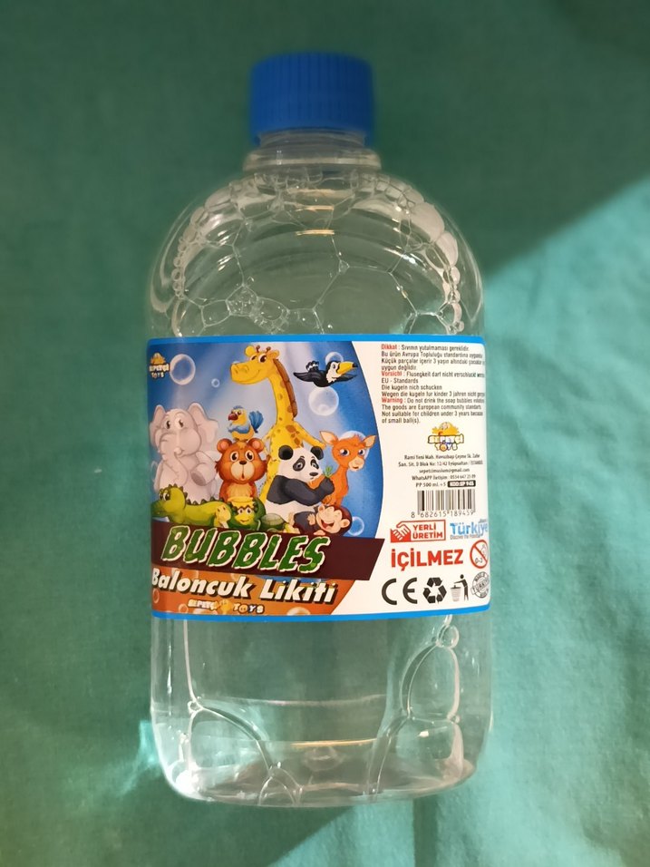 Renkli mavi baloncuk likiti, üzerinde sevimli hayvan figürleri bulunan etiketle birlikte gelir. Çocuklar için güvenli ve zehirsizdir.