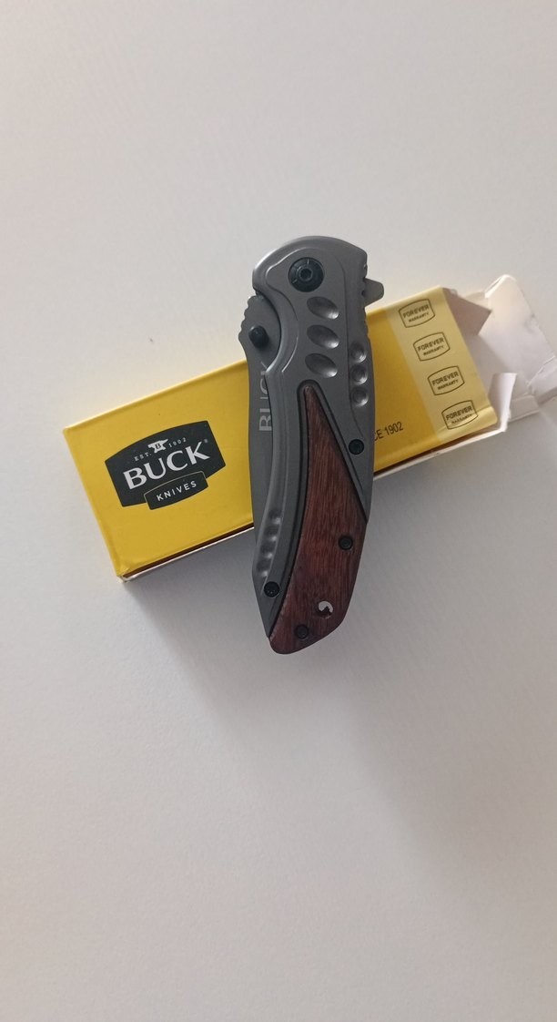 Buck katlanabilir bıçak, koyu kahverengi saplı ve sağlam yapılıdır. Orijinal sarı Buck kutusunda sunulmaktadır.