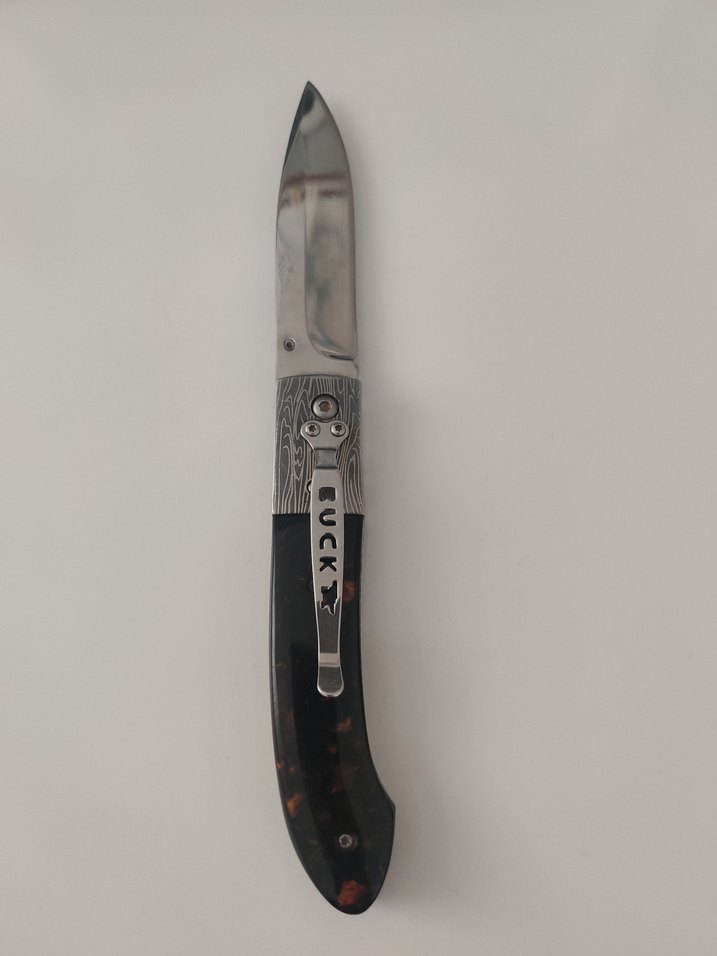 Buck Kalitesi: Hem Estetik Hem Güçlü Modern Cep Çakısı Hem günlük kullanımda yanınızdan ayırmak istemeyeceğiniz hem de koleksiyonunuza prestij katacak çok şık bir parça. Gövde üzerindeki gümüş renkli "damal/hareli" desenler ve koyu renkli mermer desenli kabze bölümüyle modern bir görünüme sahiptir. Yüksek kondisyonlu, parlak çelik yüzeye sahip ve oldukça keskindir. Bıçak üzerinde orijinal "Buck" logosu yer almaktadır. Arka kısmında yer alan sağlam metal klips (belt clip) sayesinde kemere, cebe veya çantaya kolayca sabitlenebilir. Tek el ile kolayca açılmasını sağlayan baş parmak desteği (thumb stud) mevcuttur; seri ve güvenli bir kullanımı vardır. Temiz kullanılmış, mekanizması sorunsuz ve yüksek kondisyondadır. Hem doğa sporları hem de şehir hayatı için güvenilir, şık bir yardımcı arayanlara özel.