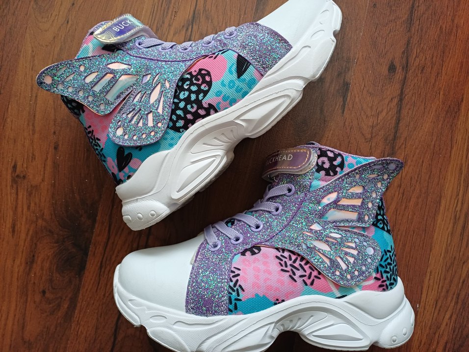 Renkli baskılı, simli detaylara sahip bağcıklı kız spor ayakkabısı, 1 kez giyildi tertemiz