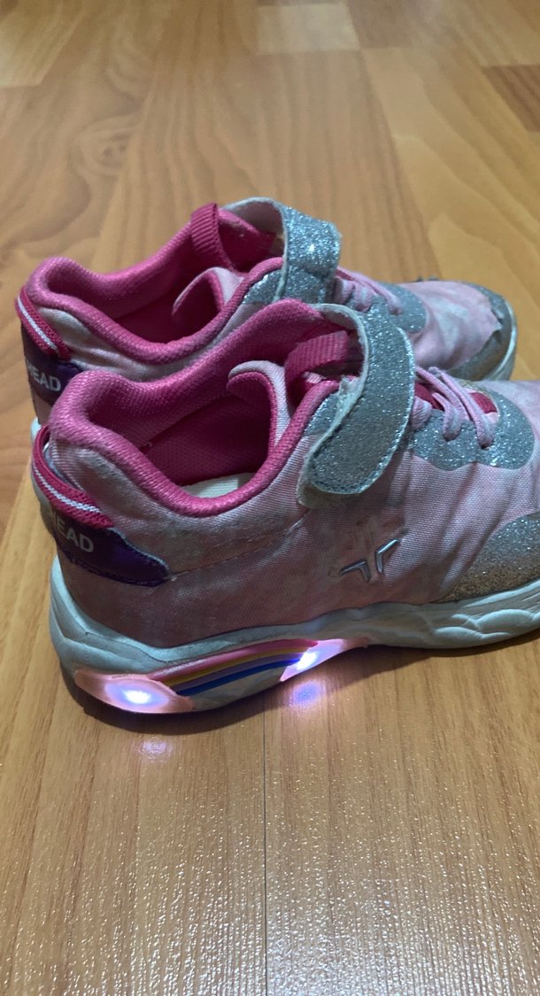 Pembe renkli, bağcıksız cırt cırtlı kız çocuk spor ayakkabısı. Renkli tie-dye desenli ve ışıklı tabanlıdır. Kauçuk malzemeden yapılmıştır. Kirlidir yıkanmadı önünde minicik bir deformasyon var gri simli kısmında