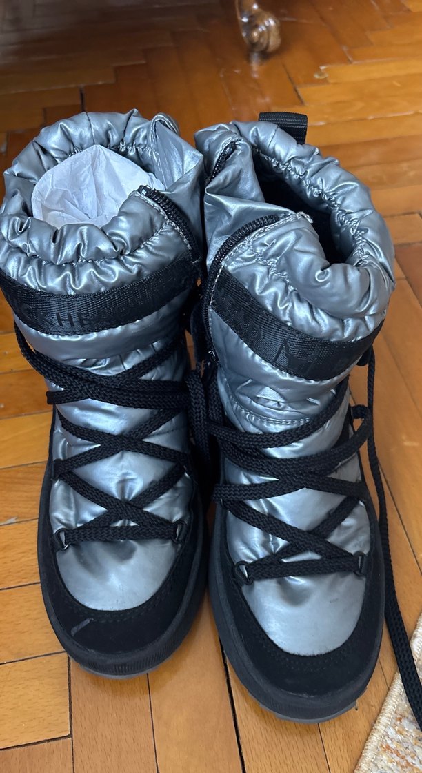Gri renkte, dolgu topuklu ve tokalı tasarıma sahip kadın botları. Kauçuk malzemeden üretilmiş, spor ve sokak stili için uygundur.