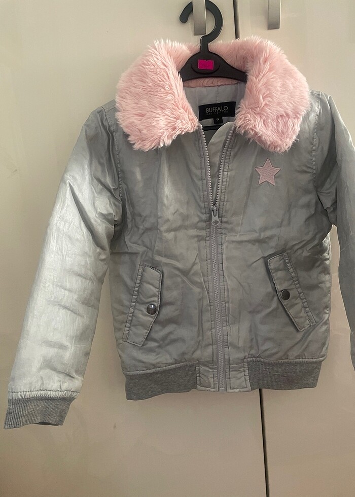 metalik gri yakası pembe peluş kürklü kız çocuk mont ceket, çok kullanışlı havalı 6-8 yaş için uygun