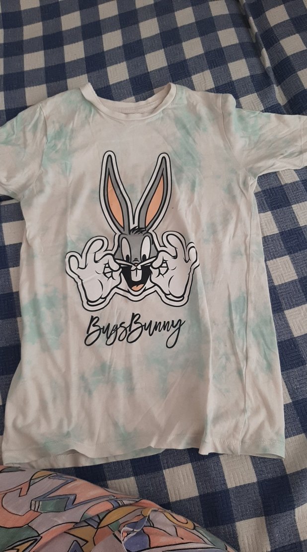 Pamuklu, gevşek kesim, kısa kollu erkek çocuk tişörtü. Pastel tie-dye desenli, Bugs Bunny baskılı ve düğmeli. Yuvarlak yakalı.8-9-10 yaş