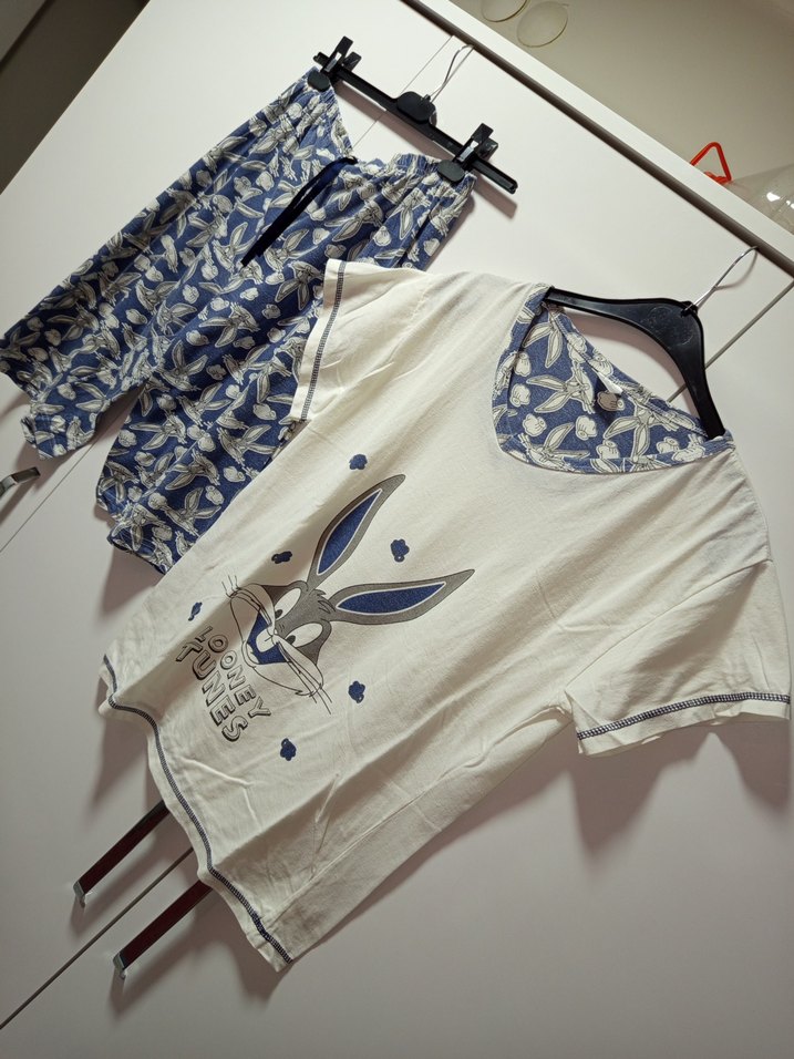 Bugs Bunny baskılı, kısa kollu beyaz üst ve uyumlu desenli mavi beyaz şortlardan oluşan bol kesim kadın pijama takımı. M/L BDN,DEFOSUZ K8SA SÜRE GİYİLDİ YIKAYIP KALDIRILDI SIFIR DEĞİLDİR 3)5 KEZ GİYİLMİŞ