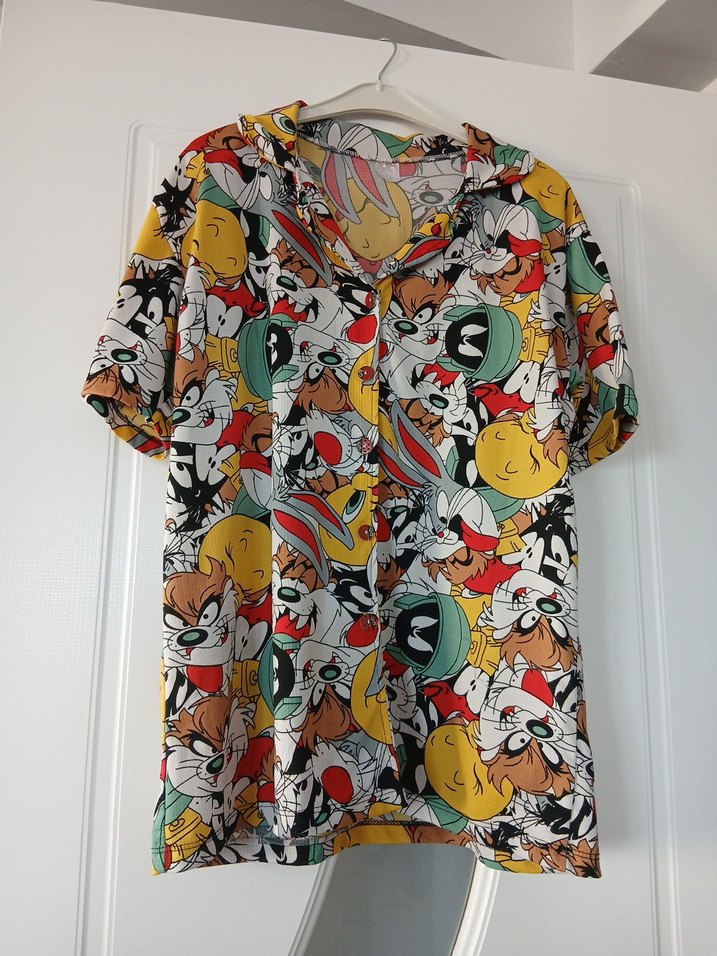 Renkli baskılı, kısa kollu, bol kesim kadın gömlek. Düğmeli, yakalı ve sentetik kumaştan üretilmiştir. Günlük kullanıma uygundur. bugs bunny temalı efsane birşiy