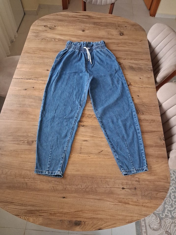 32 beden sorunsuz Mavi kot pantolon, rahat kesim ve midi boyda, bel kısmında bağcıklı lastikli detay bulunur. Günlük kullanıma uygundur.