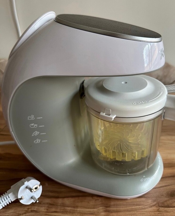 Beyaz ve gri renkte, şeffaf hazneli ve çeşitli ayar seçeneklerine sahip mutfak mikseri. Sağlam tabanlı ve kullanımı kolaydır. ⚙️