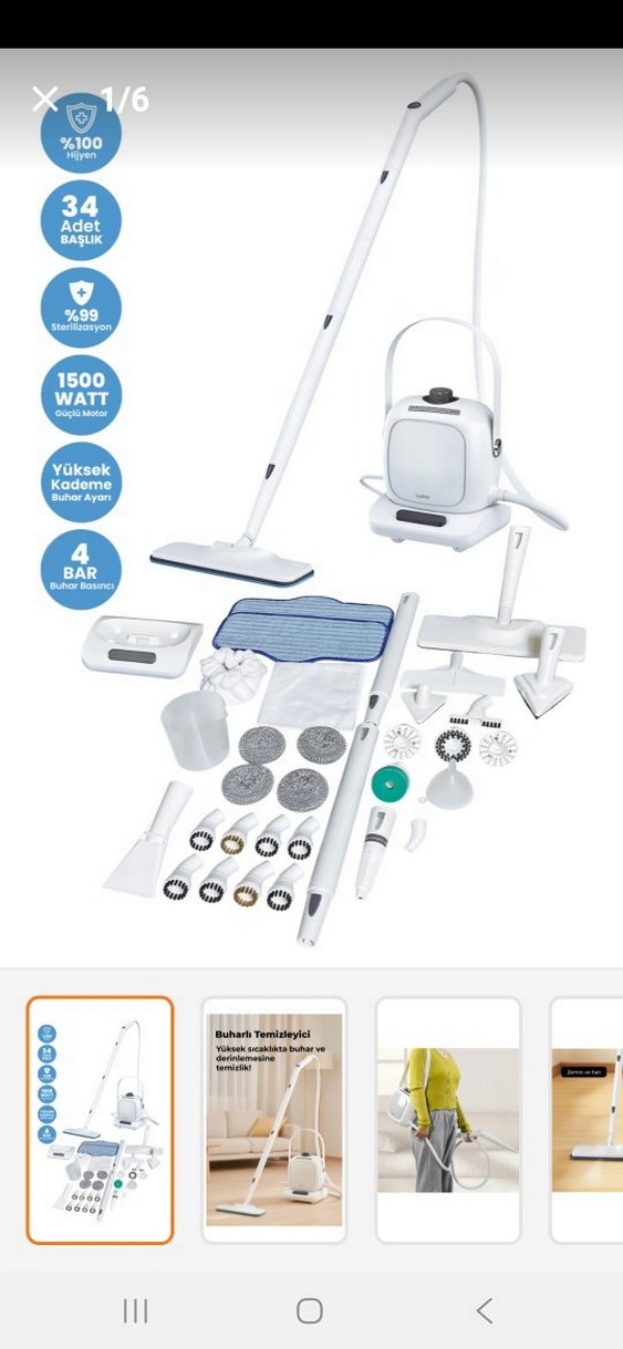 Garantisi devam ediyor kullanışlı tekerlekli omuz askılı 1500 watt güçlü motor ve 4 bar buhar basıncı ile etkili sterilizasyon ve temizlik sağlar.36 parça aparatlarıyla farklı yüzeylerde kullanıma uygundur.