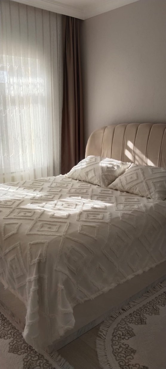 İşlemeli geometrik desenlere sahip beyaz ve gri battaniye, yumuşak ve dokulu kumaştan üretilmiştir. ️