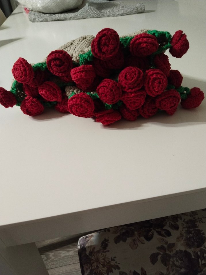 70 cm boyunda. güllerinde iki farklı renk kırmızı kullanıldı. her bir günde renk değiştirildi. Koton iple örülmüştür #buket battaniye