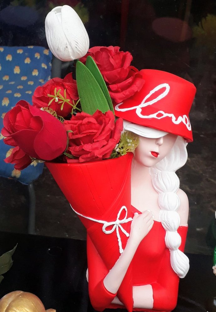 Kırmızı elbise ve şapka giymiş kadın figürini, elinde beyaz lale ve kırmızı çiçeklerden oluşan renkli bir buket tutuyor. Şapkasında beyaz 'love' yazısı var arkadaşımın yaptığı el emeği ürünler SERAMİK TOZU VE TOZ TAŞI YAPIMIDIR