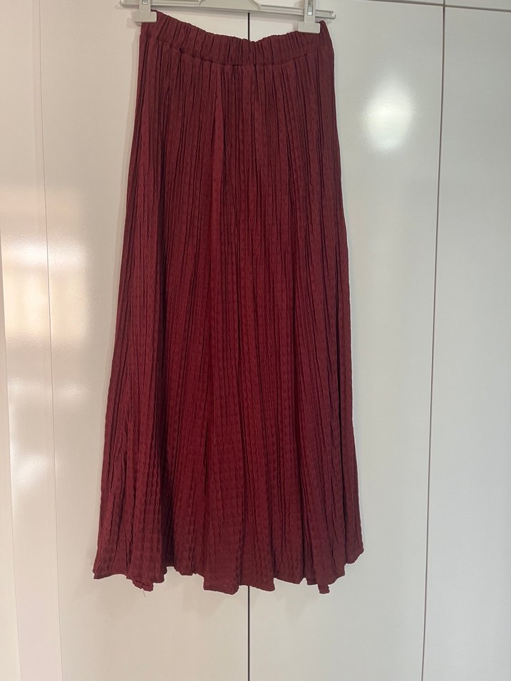 Bordo ve siyah renkli, pileli ve bol kesim uzun etek. Bohem tarzıyla günlük kullanıma uygundur. #etek