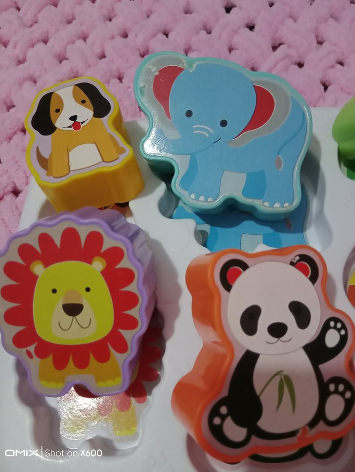 çocuk dostu malzemeden yapılmış köpek, fil, aslan ve panda figürlü renkli oyuncaklar.