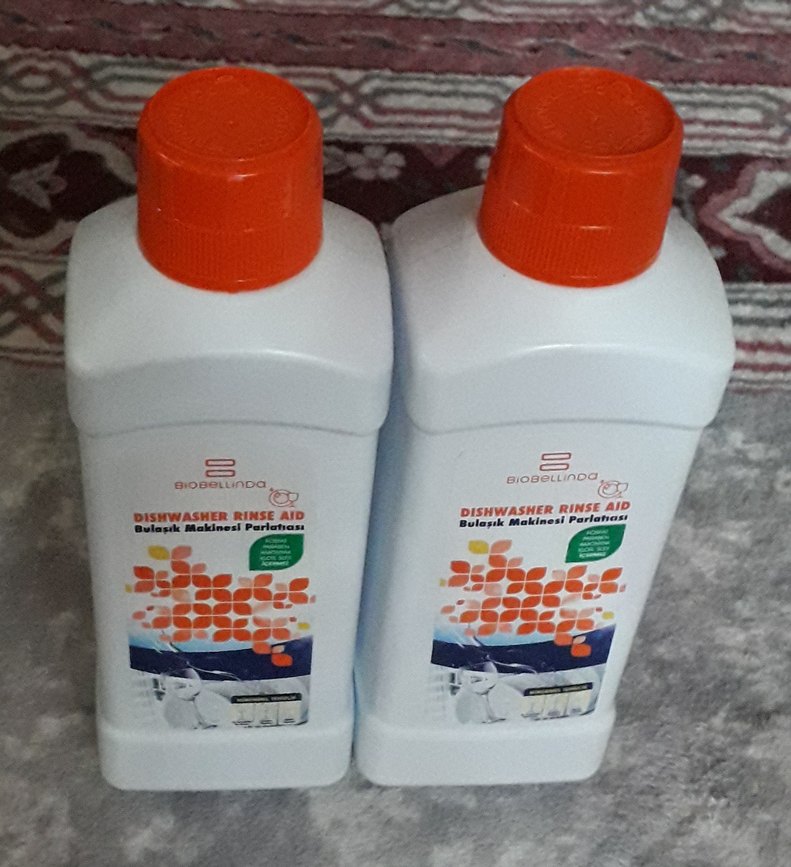 İki adet bulaşık makinesi parlatıcısı, bulaşıkların kurumasını ve parlaklığını artırır. Her şişe turuncu kapaklıdır.✨