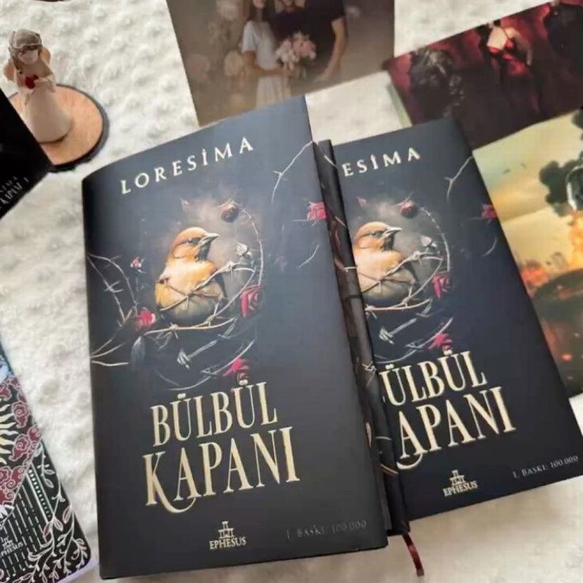 Loresima'nın "Bülbül Kapanı" adlı romanı, dikenli dallar ve kırmızı güllerle çevrili bir bülbül resmi bulunan koyu kapaklı bir kitaptır.