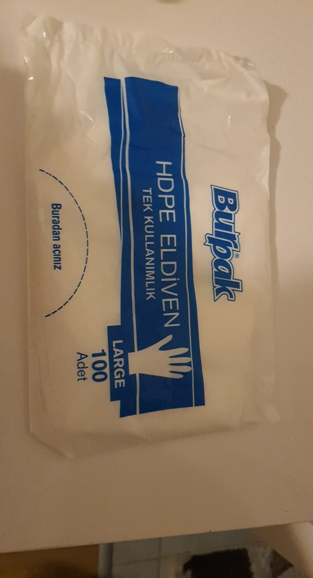 Bulpak markasına ait large boy tek kullanımlık HDPE eldivenlerden 100 adet. Kolay açılır özellikli paketle sunulur.