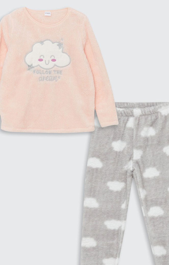 Yumuşak üst kısmında gülen bulut baskısı ve pastel tonlar bulunan, beyaz bulut desenli gri pantolonla tamamlanan çocuk pijama takımı. ☁️