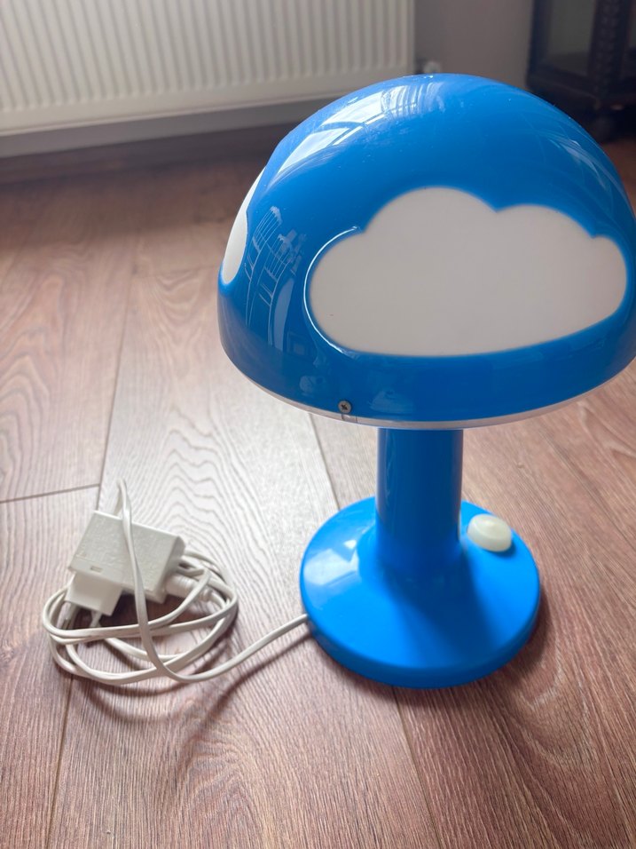 Mavi, kubbe şeklinde başlığı üzerinde beyaz bulut desenleri bulunan masa lambası. Yuvarlak tabanlı ve yan tarafında beyaz açma düğmesi var. Beyaz güç kablosu ve adaptörüyle birlikte.
