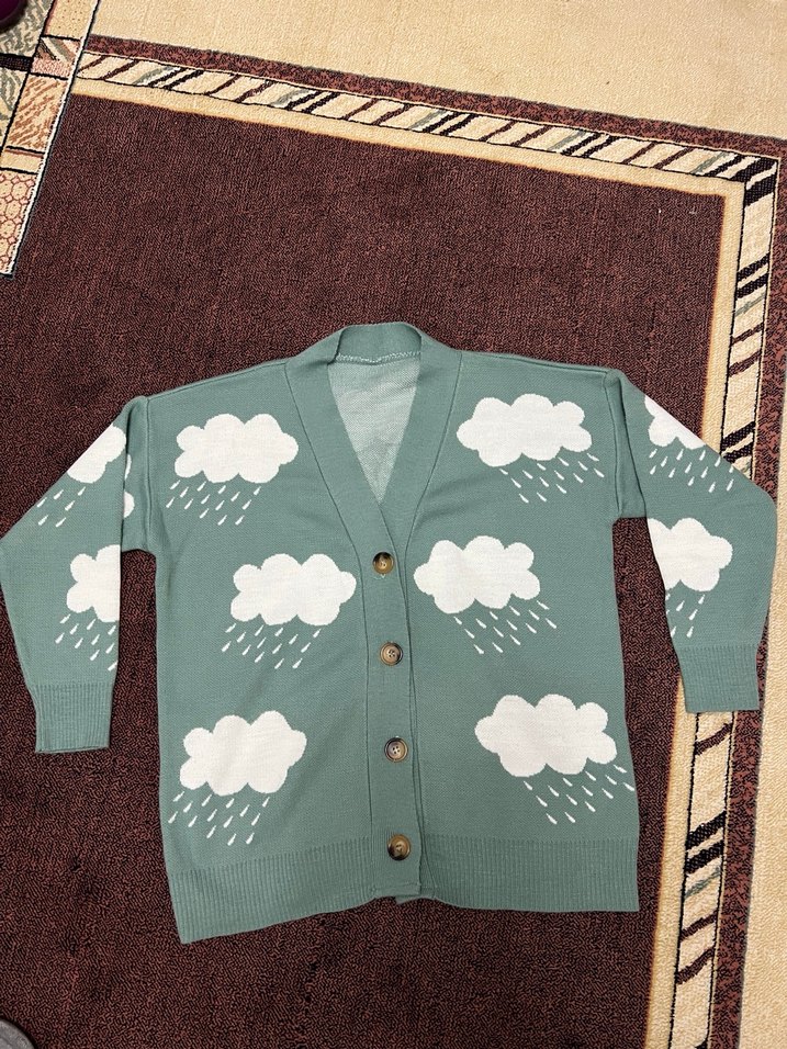 Bulut ve yağmur desenli, düğmeli, uzun kollu rahat örgü hırka. Sokak tarzı için uygun ve konforlu bir parça. ☁️ düğmeleri kapalı iki koltuk arası 55 cm— boyu 63,5 cm
