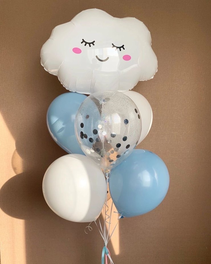 Gülen yüzlü beyaz bulut balon ve pastel mavi, beyaz ile konfeti dolu şeffaf balonlardan oluşan set. Bulut balon iki adet mavi balon iki adet beyaz balon bir adet şeffaf balon 3 metre mavi rafya
