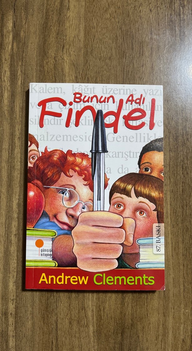 Andrew Clements'in "Bunun Adı Findel" kitabı, kapağında meraklı çocuklar ve bir kalemle yazma ve yaratıcılık temasını işler. ✏️