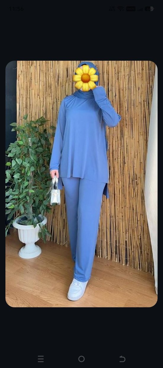 Pastel mavi renkte, uzun kollu ve yüksek yakalı, salaş kesim kadın takımı. Yumuşak sentetik kumaştan, günlük kullanıma uygun rahat ve şık görünüme sahip. likralı
