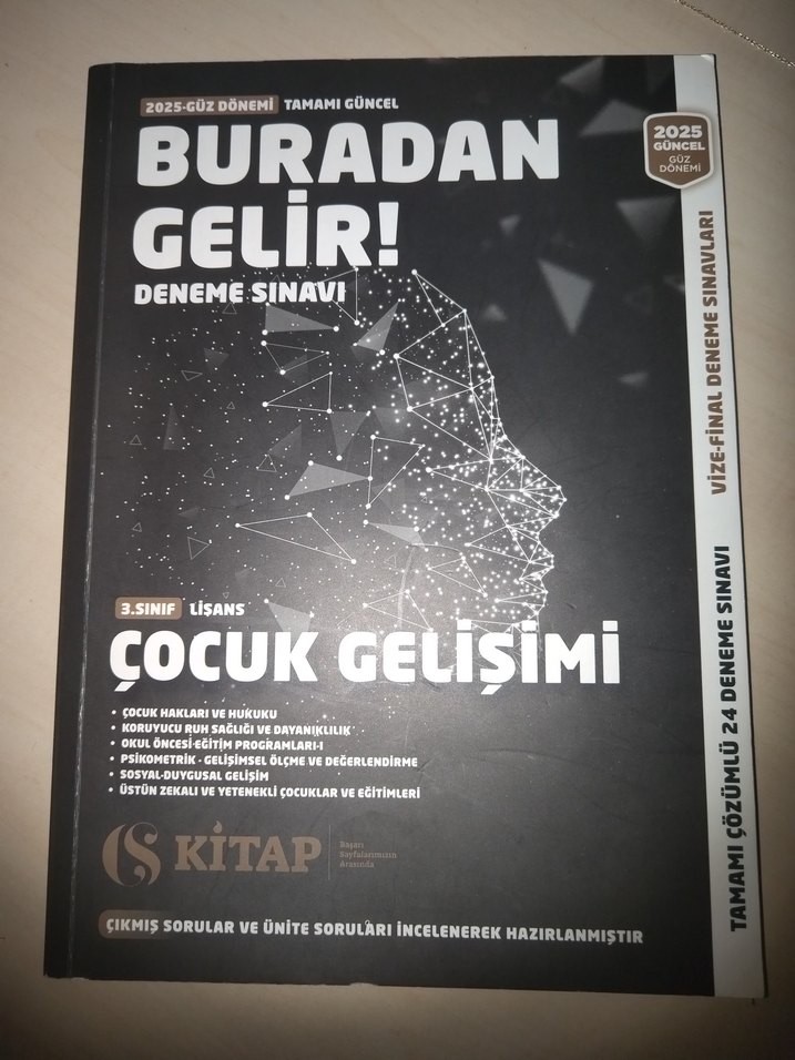3. sınıf Çocuk Gelişimi deneme sınavı kitabı. Çıkmış sorular ve ünite soruları incelenerek hazırlanmıştır. Çocuk hakları, koruyucu ruh sağlığı ve dayanıklılık, okul öncesi eğitim programları 1 ve psikometrik gelişimsel ölçme ve değerlendirme, sosyal duygusal gelişim, üstün zekalı ve yetenekli çocuklar ve egitimleri derslerinj içerir. Sadece çocuk haklarının vize kısmı kursun kalemle görüldüğü gibi işaretli olup geri kalan tertemizdir üstüne çözülmemiştir. 3.5 ortalama yapmamı sağlayan kitaptir kesinlikle öneririm.
