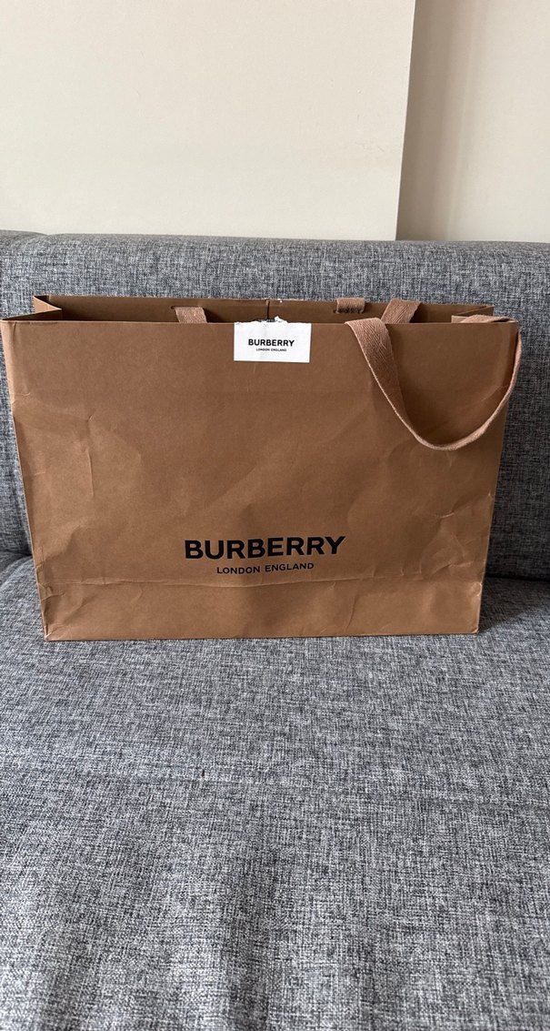 Kahverengi ve koyu kahve baskılı Burberry logolu, sağlam saplı kağıt -karton poşet alışveriş çantası. 42/29/12 cm ebatlarda alt katlama yerinde küçük bir yıpranma mevcut