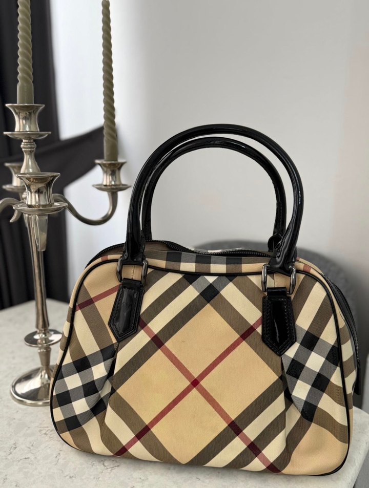 Bej renkli deri çanta, koyu ekose desenli ve kemerli saplara sahip. Klasik şıklık ve streetwear tarzını birleştirir, günlük kullanıma uygundur. BURBERRY orjinal.