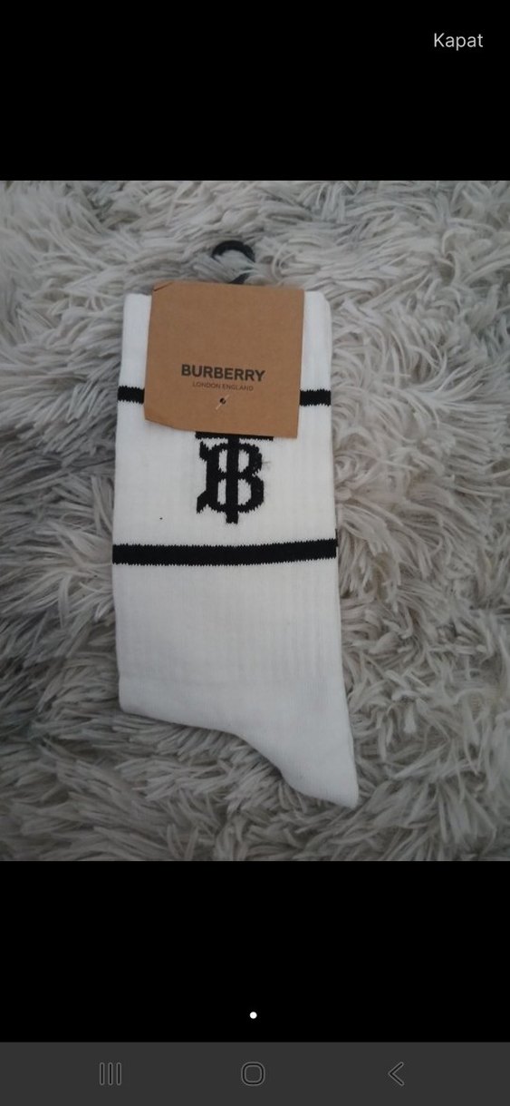 Burberry baskılı siyah logo ve çizgilerle beyaz, midi boy, erkek soket çorap. Rahat ve şık bir görünüm sağlar.