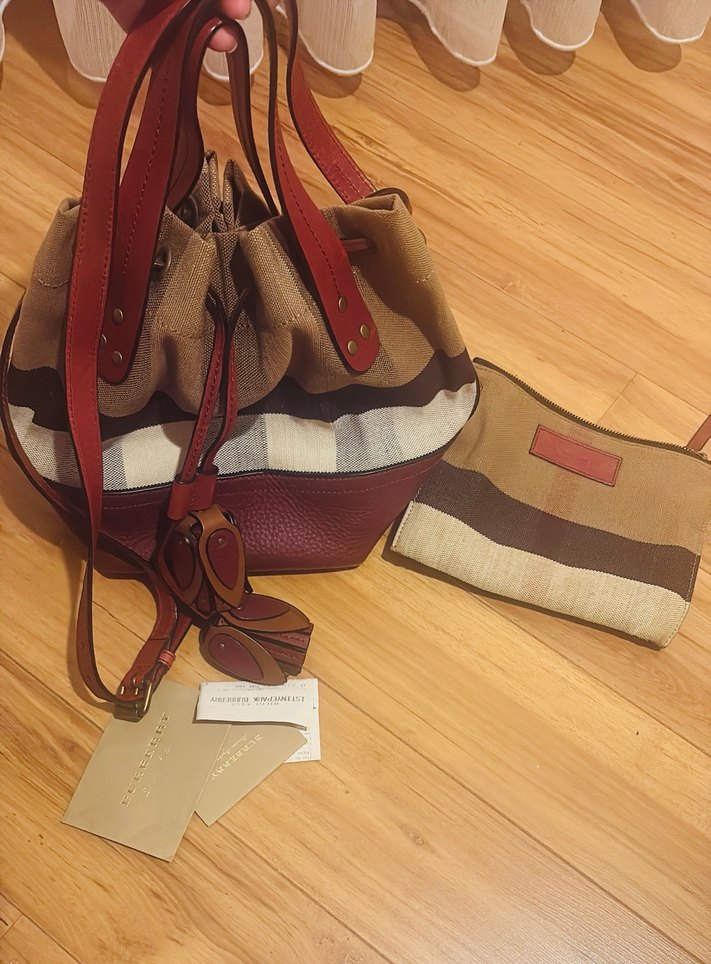 Bordo deri tokalı, baskılı kumaş detaylı kadın çantası ve uyumlu küçük çanta. Günlük bohem stil için uygun. İstinyeparkBurberry mağazasından alınmıştır