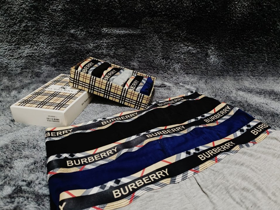 Burberry marka baskılı, koyu çok renkli, mini kesim ve vücuda oturan erkek boxer. Rahat ve şık tasarım.