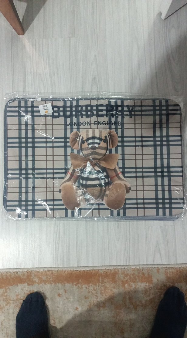Kahverengi ve gri tonlarında Burberry desenli, yumuşak dokulu, ortasında ayıcık figürü bulunan banyo paspası. Adet 120 lira