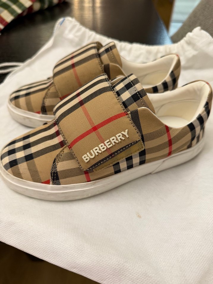 Burberry yazılı, desenli, kahverengi erkek spor ayakkabısı, tokalı ve kauçuk tabanlıdır. Günlük sokak stili için uygundur.
