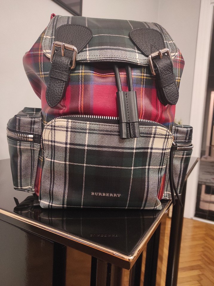 Burberry marka, çok renkli ekose desenli, tokalı ve sentetik kumaşlı kadın sırt çantası, sokak stili ve günlük kullanım için uygundur.