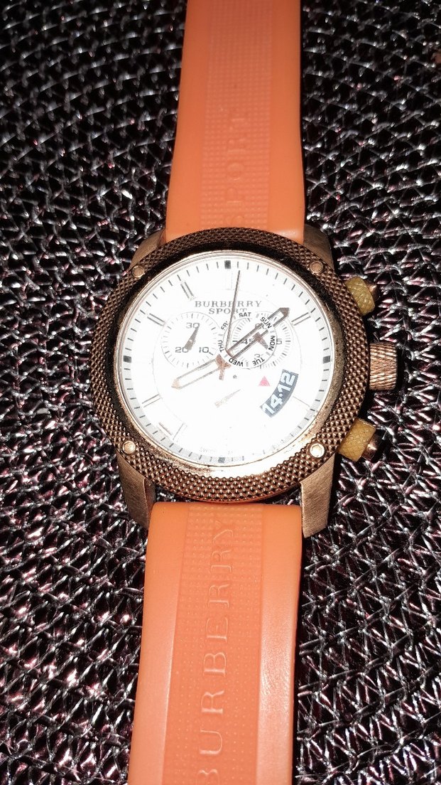 Kahverengi dokulu metal kasalı, beyaz kadranlı ve tarih göstergeli erkek saati. Canlı turuncu Burberry logosu olan kayış ile klasik ve bohem tarzda. ⌚icindeki bi yuvarlak düşük onun dışında sıkıntısı yok