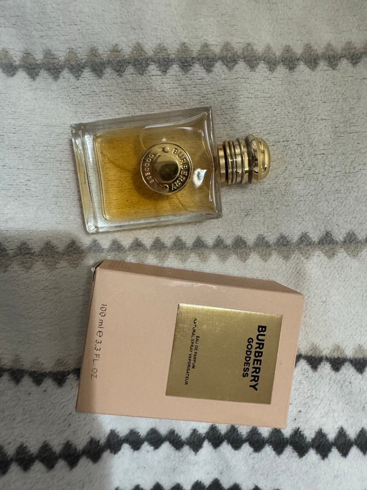 Burberry Goddess kadın parfümü, 100 ml şişede, altın detaylı kapak ve şık kutusuyla sunuluyor. Zarif bir koku seçeneği.