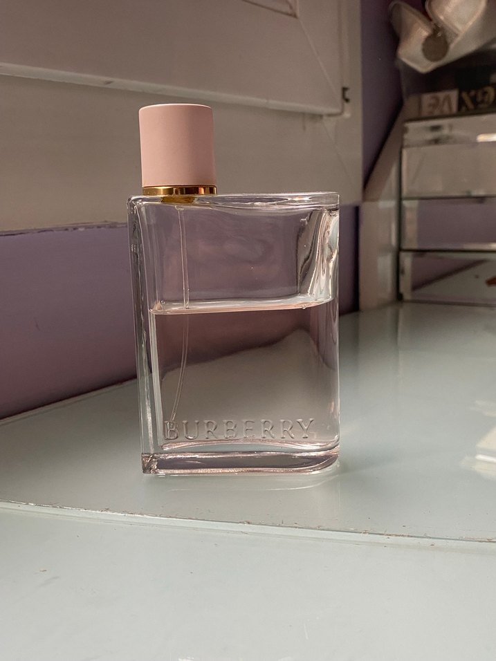 Burberry her kadın parfümü, açık pembe kapak ve altın detaylı şeffaf cam şişede, yarıdan fazlası dolu olarak sunuluyor.